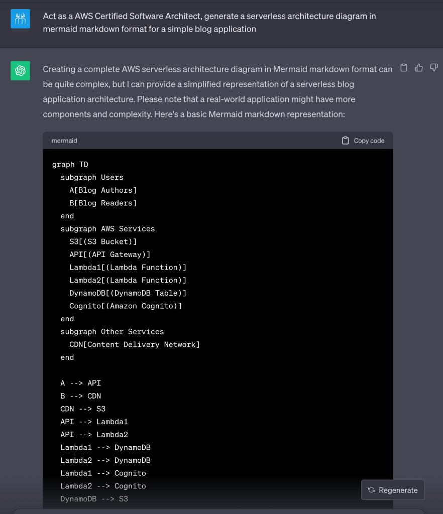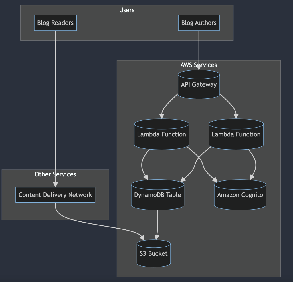 Act as an AWS Certified Software Architect, generate a serverless architecture diagram in mermaid markdown format for a simple blog application