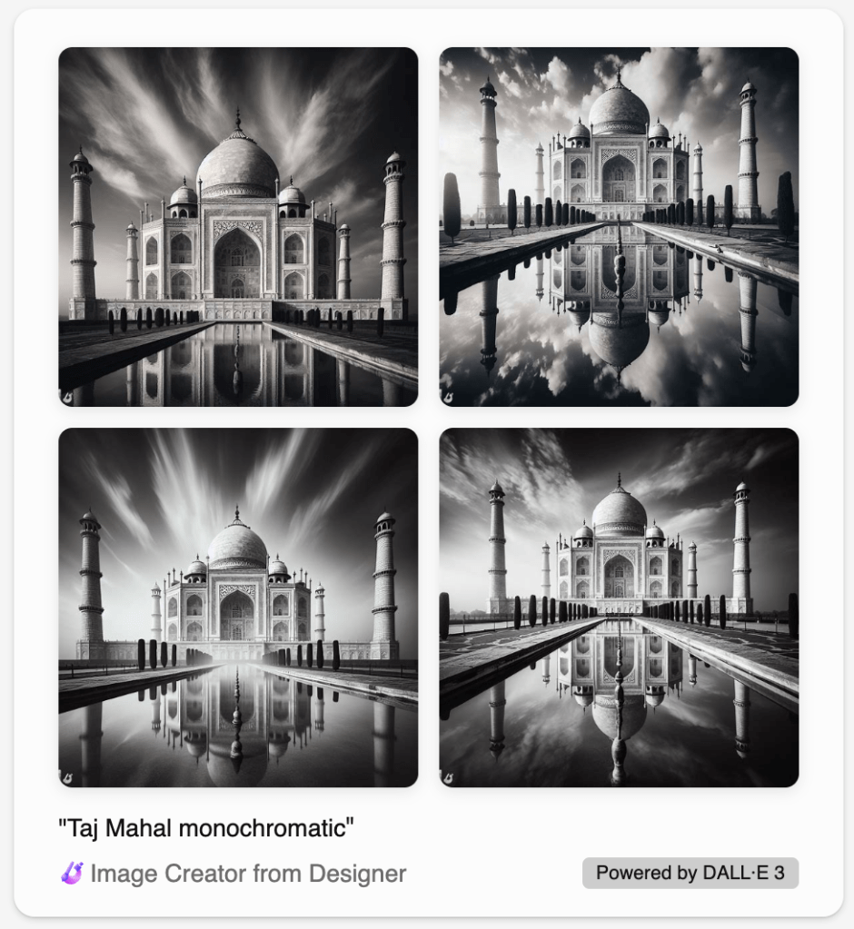 Prompt – Generate an image of Taj Mahal in a monochromatic style